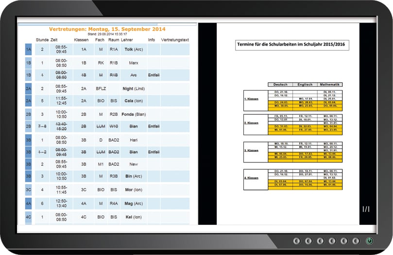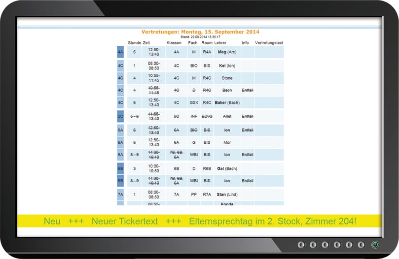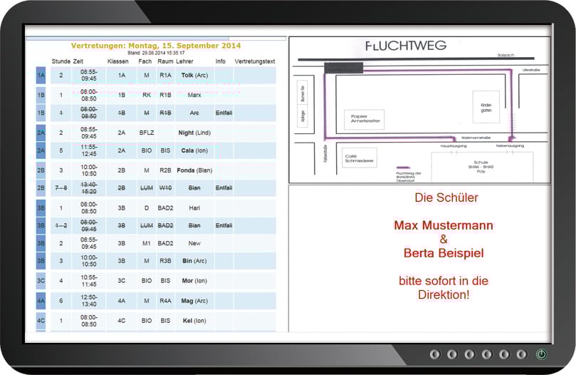 Diese Inhalte können zeitlich gesteuert und in beliebiger Reihenfolge über einen handelsüblichen Windows-PC auf dem jeweiligen LCD-Display (z.B. an der Wand im Aufenthaltsbereich der Schüler montiert) angezeigt werden - z.B. Powerpoint Präsentationen, Videos, Grafiken, HTML- oder PDF-Dateien - und zwar vollautomatisch.