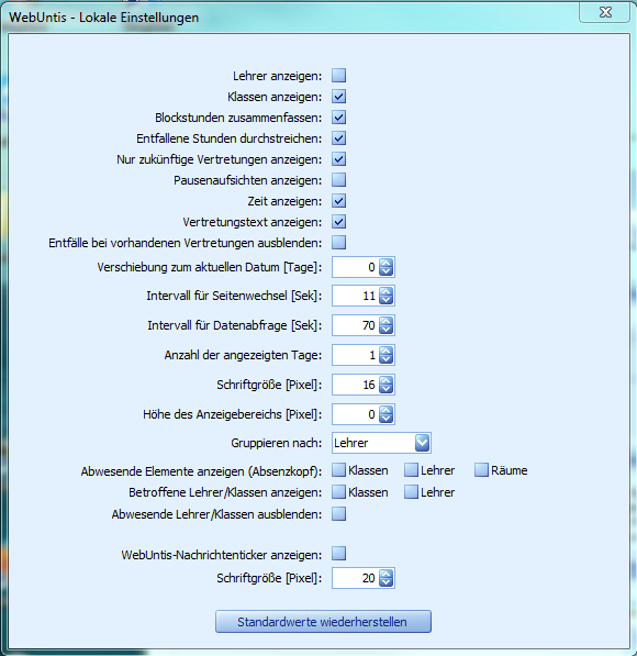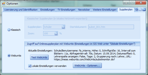 Die neuen Optionen befinden sich direkt in den Client-Optionen in der Registerkarte "Supplierplan". Zum Aktivieren klicken Sie einfach die Option "Lokale Einstellungen verwenden" an und klicken danach auf "WebUntis - Optionen..."