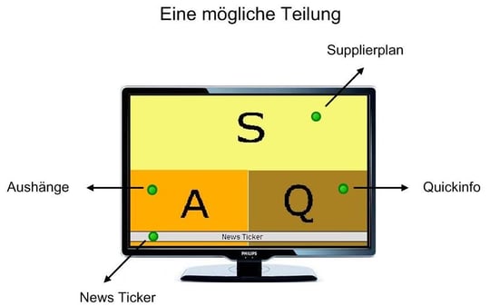 Die Informationsverteilung erfolgt zentral gesteuert auf LCD-/LED-TV (z.B. 46 Zoll), Beamer, Computermonitore oder ähnliches - seien es im vorhinein geplante Informationen oder kurzfristige Meldungen und Inhalte. Um unterschiedliche Inhalte gleichzeitig anzeigen zu können, kann der Bildschirm in mehrere Bereiche unterteilt werden.